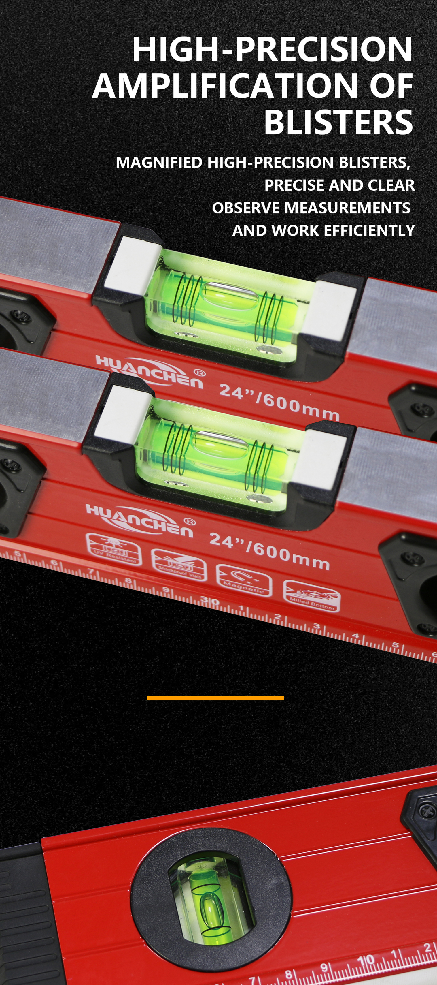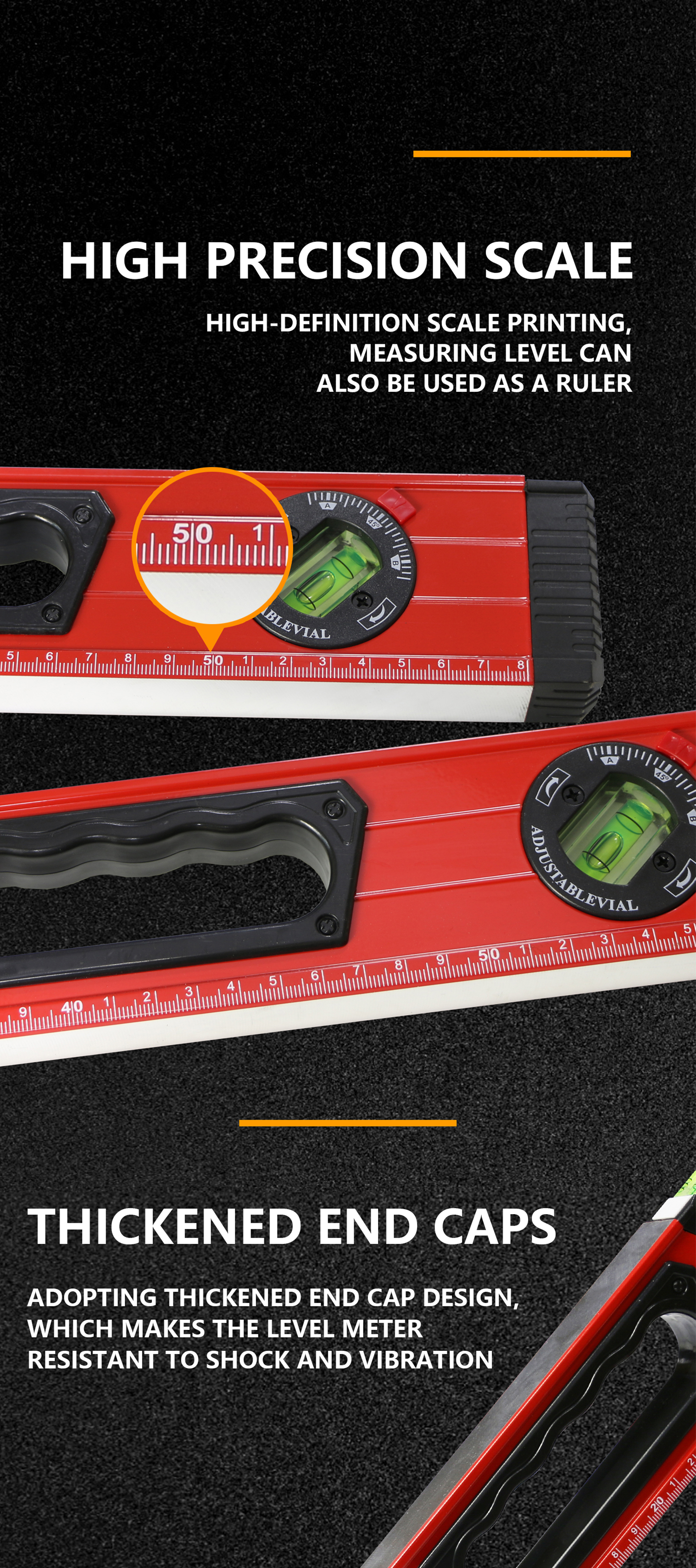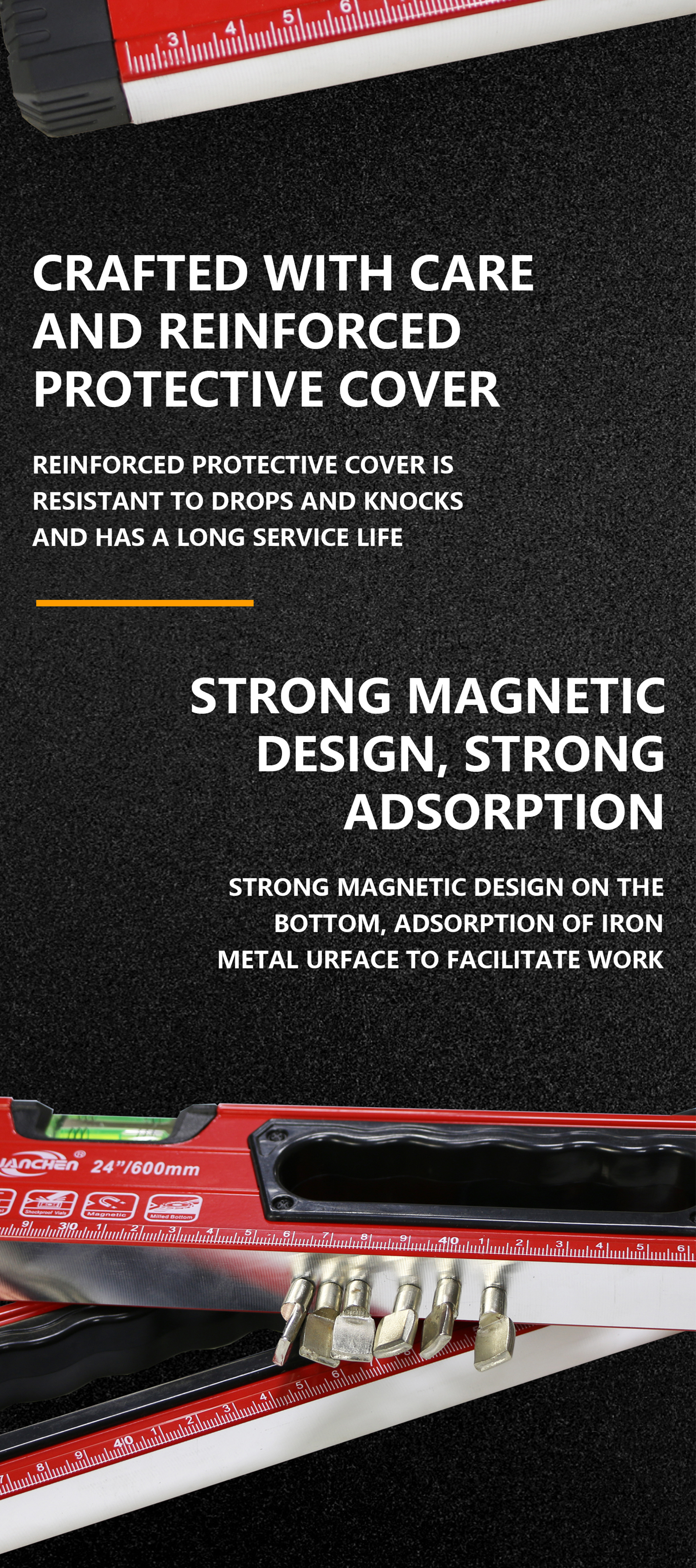 ● 300 mm-400 mm zonder handgreep, 500 mm met enkele handgreep, 600 mm en hoger met dubbele handgreep Zachte rubberen eindkappen om het niveau te beschermen
