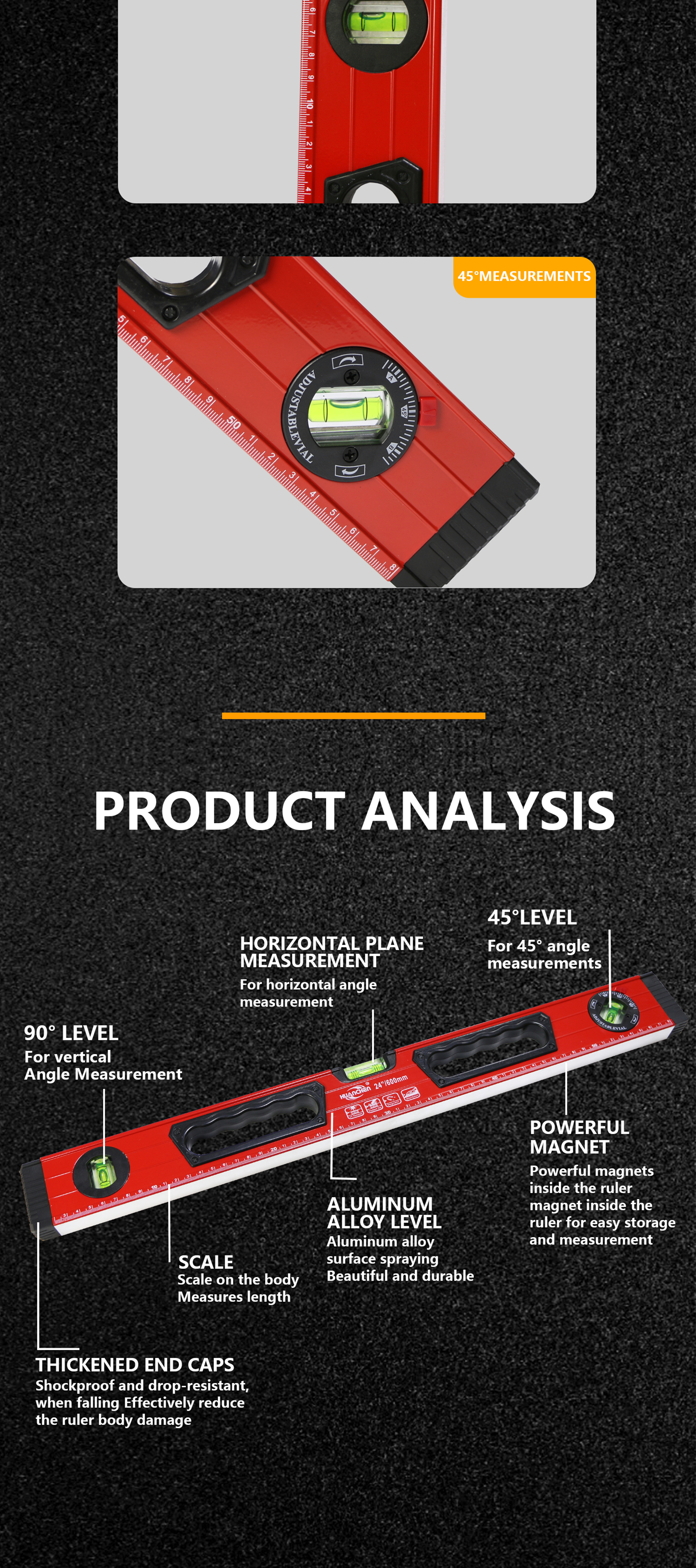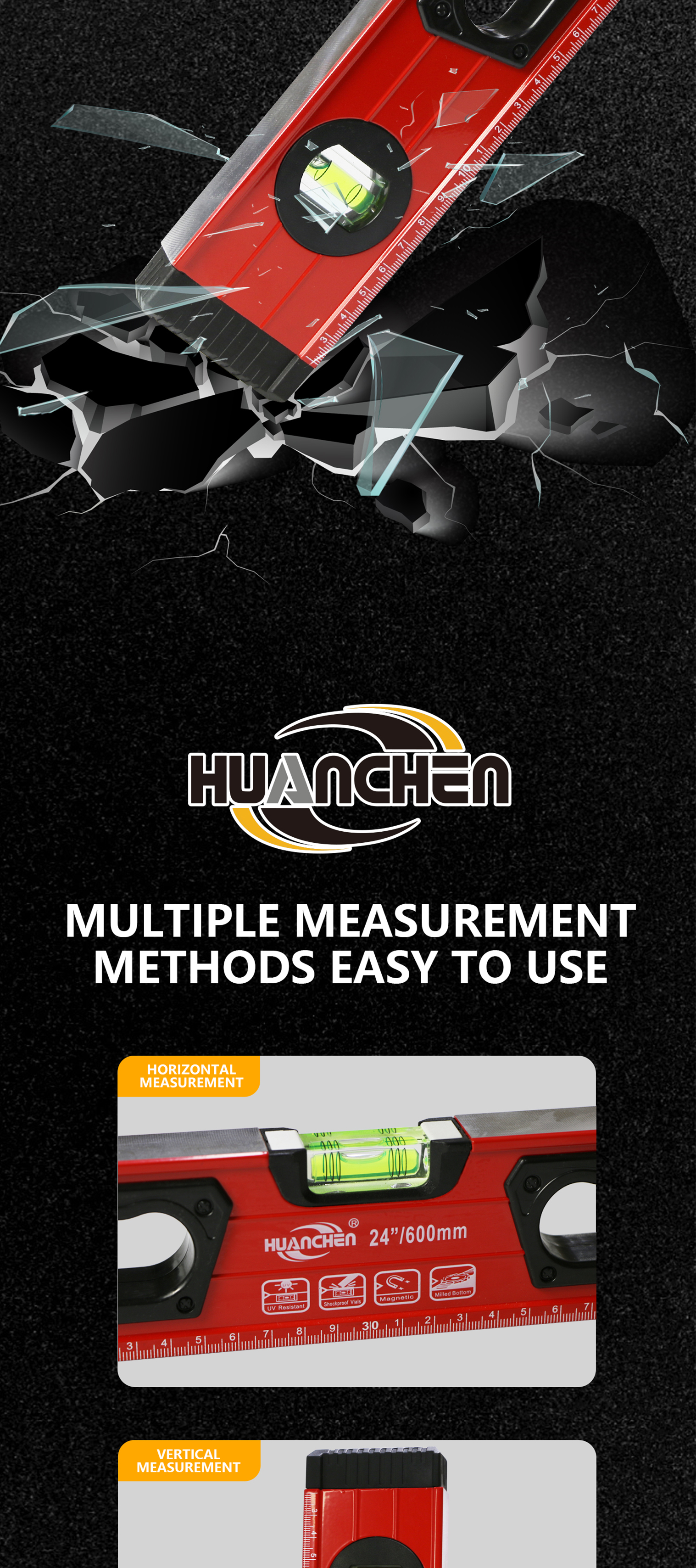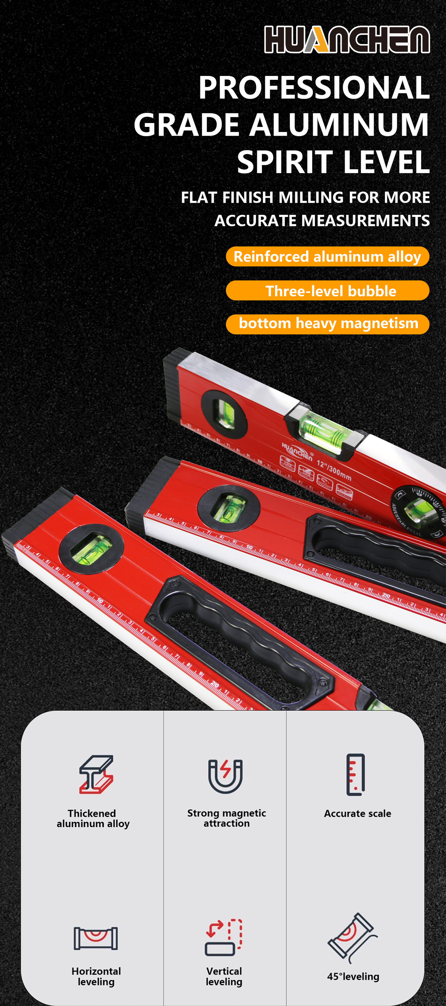 ● 300 mm-400 mm zonder handgreep, 500 mm met enkele handgreep, 600 mm en hoger met dubbele handgreep Zachte rubberen eindkappen om het niveau te beschermen